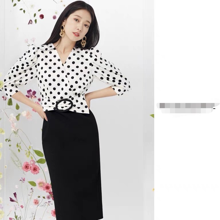 韩国朴信惠海报款定制款波点印花腰带装饰泡泡袖优雅假两件连衣裙热门设计联盟服务商