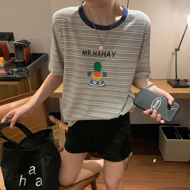 2125864韩国拼色圆领印花条纹短袖2021年新款女设计感小众T恤夏季热门设计联盟服务商