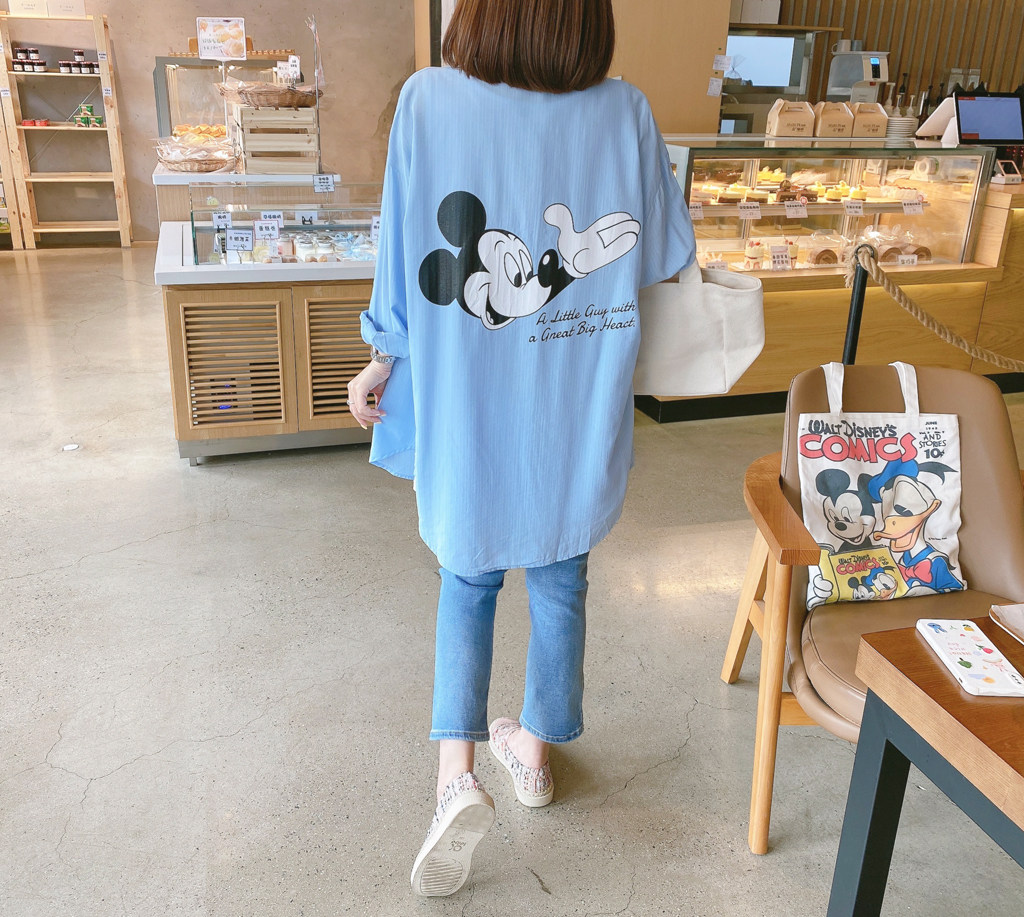 兔美善韩国代购女装 21春新 背后卡通米奇个性标签休闲中长款衬衫热门设计联盟服务商