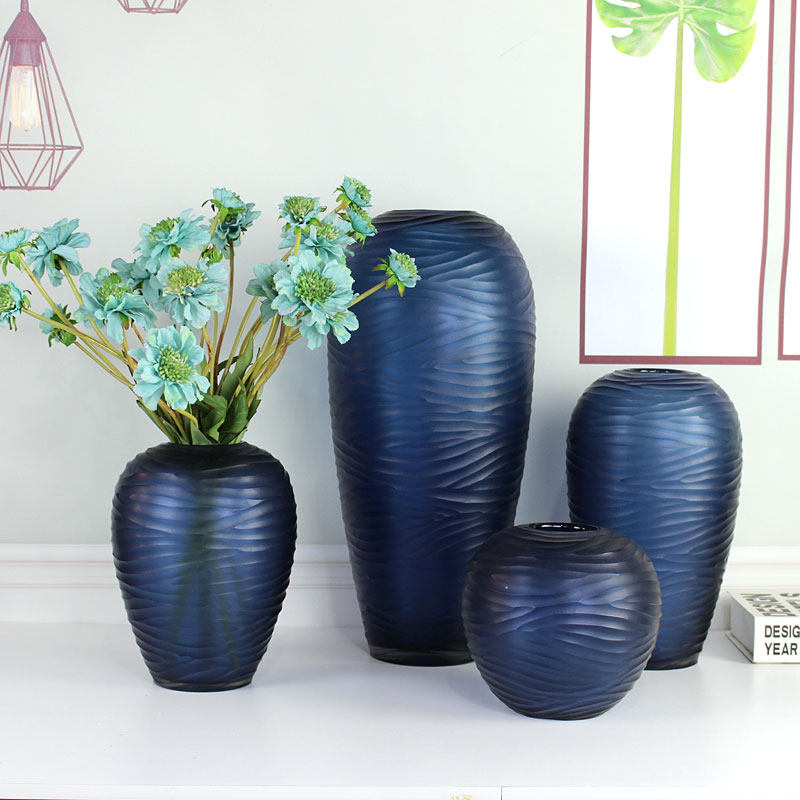 欧式蓝色大号刻磨玻璃花瓶水波纹个性插花居家装饰摆件客厅样板间热门设计联盟服务商
